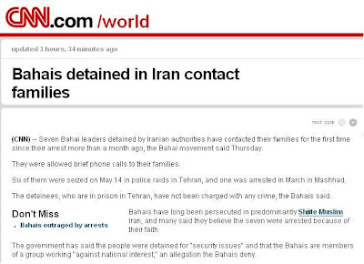------------------------------------------------Em 14 de Maio, o governo iraniano prendeu seis proeminentes líderes baha’is e acusou-os de "colocar em perigo a segurança nacional". O momento das detenções levou a especulações de que o governo iraniano estaria a tentar associar estes líderes à explosão de Abril num centro religioso em Shiraz, que matou catorze pessoas. Considerando que a instituição clerical iraniana acredita que a existência de minorias religiosas mina a ortodoxia xiita oficial, estas detenções são apenas mais um marco negro no longo e sombrio registo iraniano de protecção de direitos humanos individuais e liberdade religiosa.