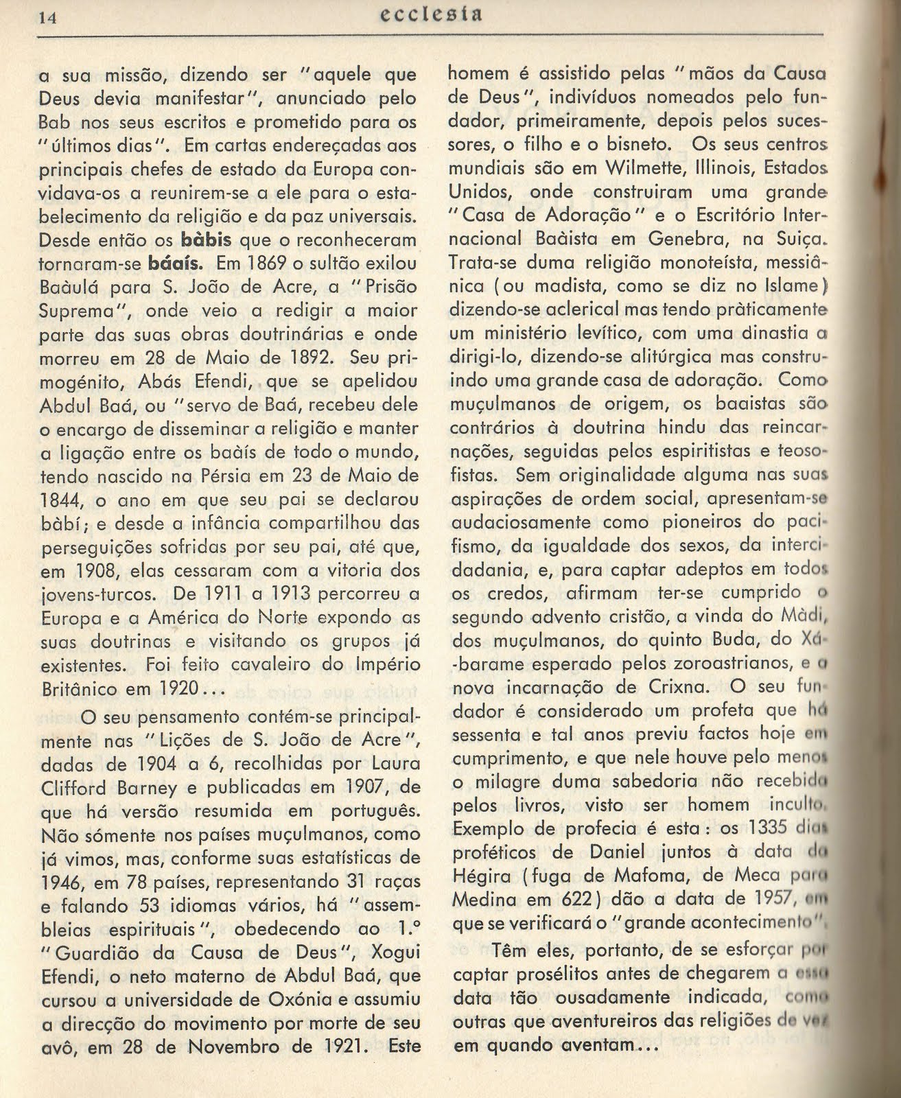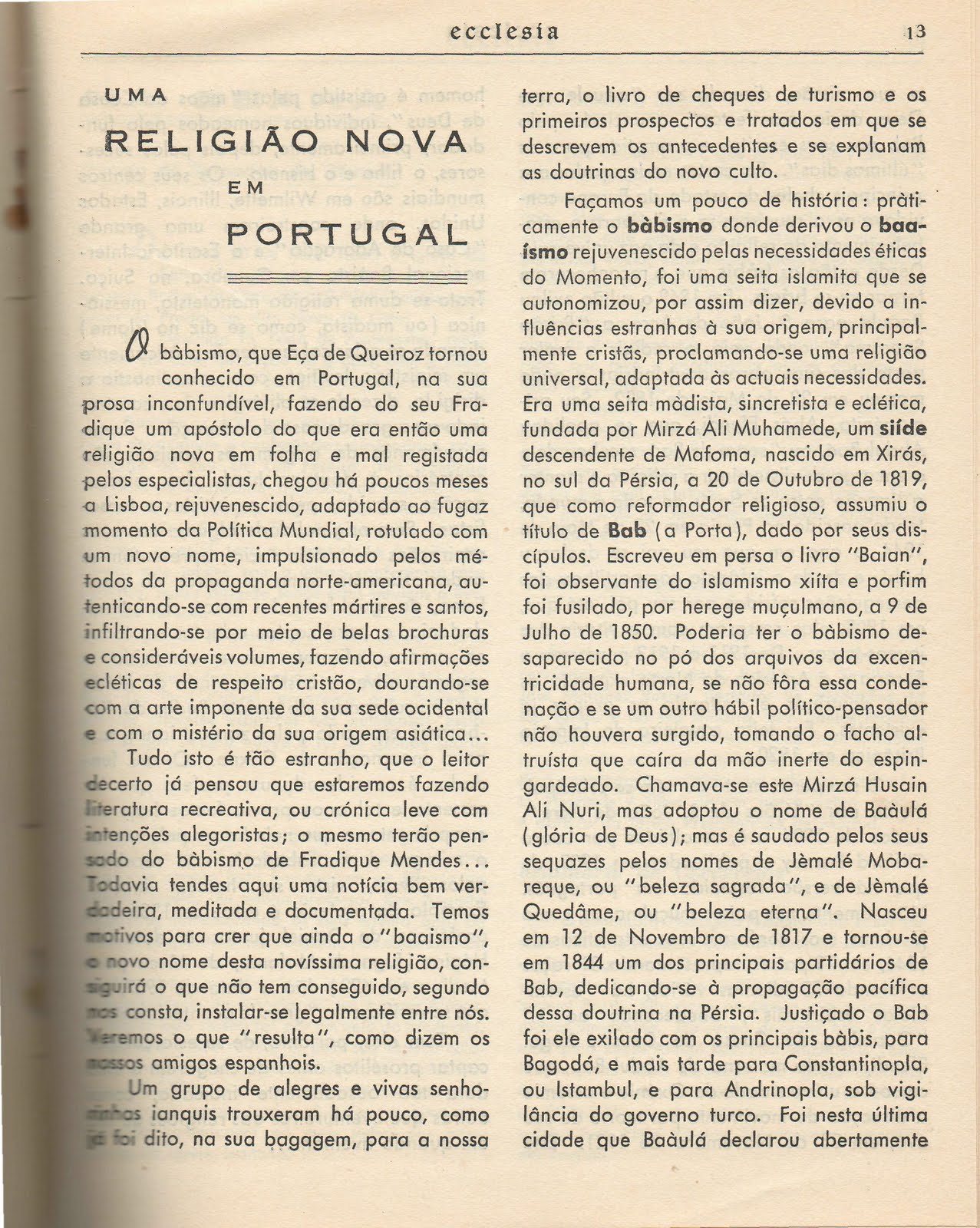 O bàbismo, que Eça de Queiroz tornou conhecido em Portugal, na sua prosa inconfundível, fazendo do seu Fradique um apóstolo do que era então uma religião nova em folha e mal registada pelos especialistas, chegou há poucos meses a Lisboa, rejuvenescido, adaptado ao fugaz momento da Política Mundial, rotulado com um novo nome, impulsionado pelos métodos da propaganda norte-americana, autenticando-se com recentes mártires e santos, infiltrando-se por meio de belas brochuras e consideráveis volumes, fazendo afirmações ecléticas de respeito cristão, dourando-se com a arte imponente da sua sede ocidental e com o mistério da sua origem asiática...