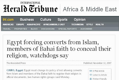 Aqui fica a tradução(um pouco apressada) do artigo ontem publicado no Washington Post (Baha'is in Egypt fight for recognition as people; também aqui). O texto é de autoria de Cynthia Johnston, da agência Reuters. Os sombreados a amarelo são da minha responsabilidade.